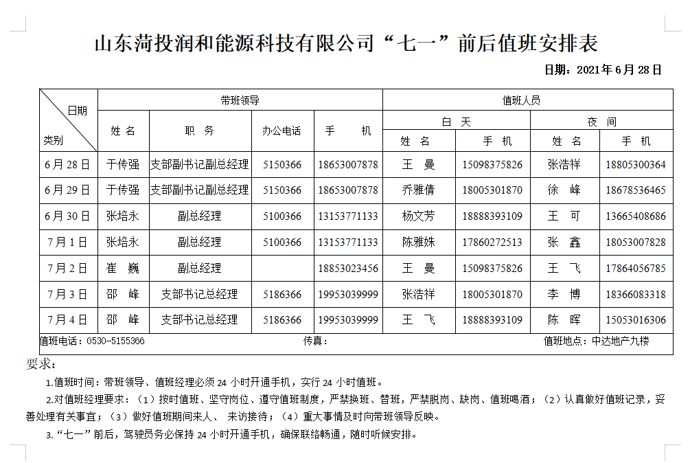 山東菏投潤和能源科技有限公司 “七一”前后值班安排表